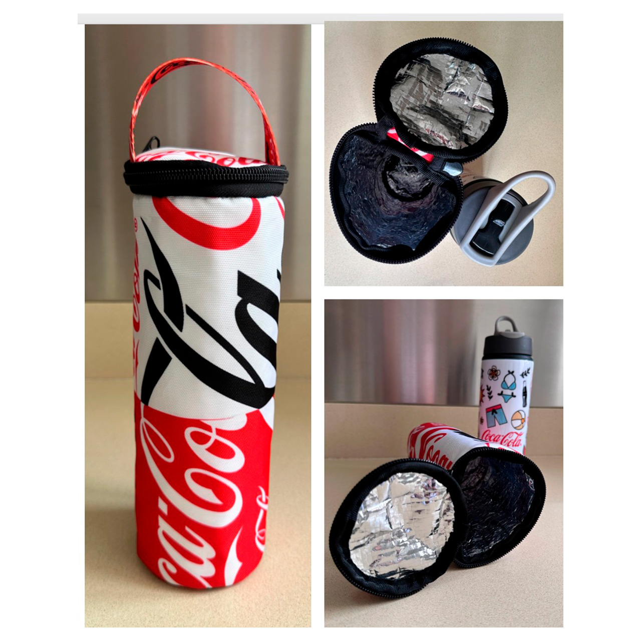 Porta termo (tipo lonchera) fabricado con aislante térmico para preservar mejor la temperatura de las bebidas.